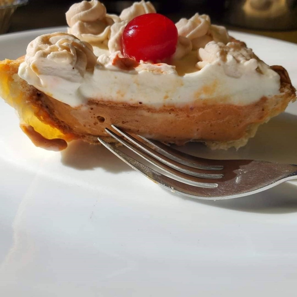 All the goodness of a root beer float including the fizz in a pie. This pie has a root beer pastry cream, chantilly root beer whipped cream and 9 maraschino cherries along with a secret ingredient that makes this pie fizz in your mouth, just as a great root beer float does.