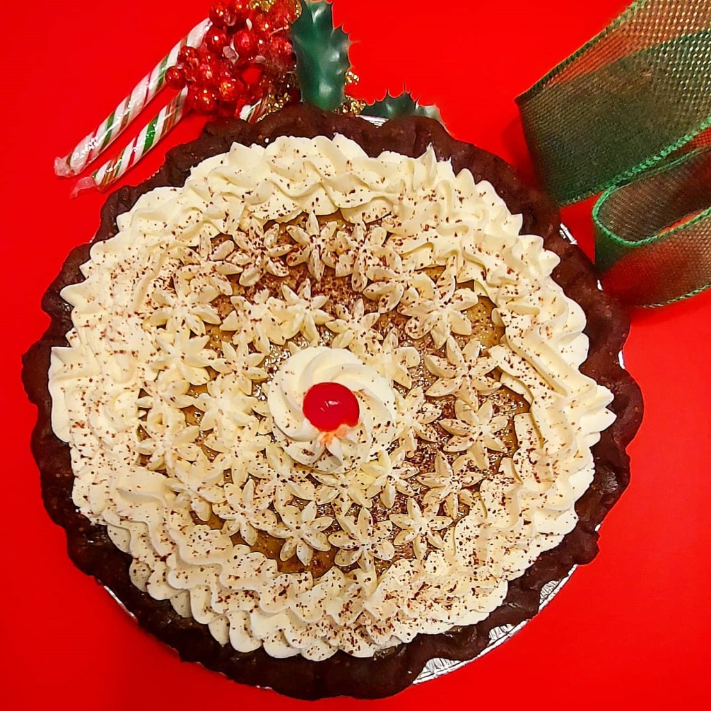 This adults only pie is made with a chocolate sable pastry crust, filled with a coffee custard that has authentic Bailey’s Irish cream to it and then is topped with Bailey’s Chantilly Cream a light dusting of cocoa and a maraschino cherry to top it off. Over 3 oz of Bailey’s Irish Cream is used in making this pie.