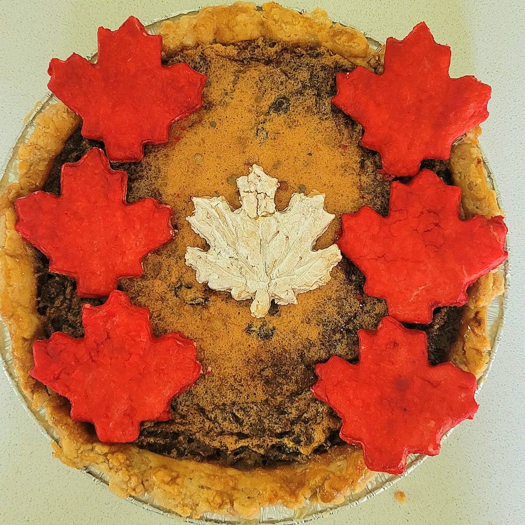 The Iconic Canadian Butter Tart turned turned into a pie. Picture the sweet syrup of butter Tarts along with the classic addition of plump raisins in a flaky pie crust. Topped with Vanilla Chantilly whipped cream and hand painted red Canadian Maple Leaves. This pie originally came out to celebrate Canada Day. It is also the filling used to create the HOME ALONE PIE. It is the perfect pie for customizing.
