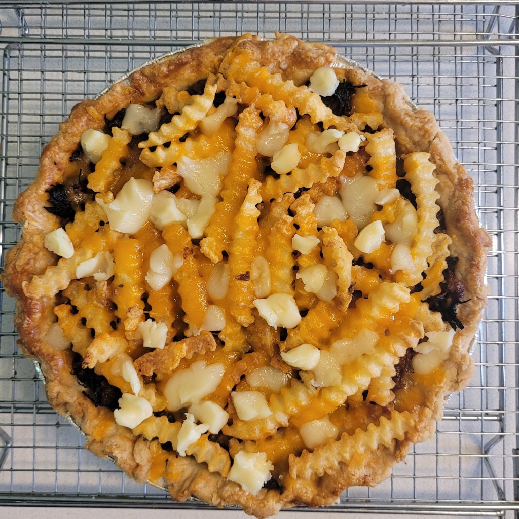Over 1 lb of ground beef, bacon, onion, Ange’s homemade dill pickles, cheddar cheese in a special homemade bbq type sauce. This is a FAN FAVORITE PIE!