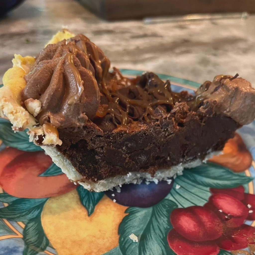 Ange’s flaky pie crust filled with her own fudgy decadent chocolate chip brownies, topped with her gooey caramel sauce, chocolate whipped cream and drizzles of chocolate ganache. This pie fills all of your cravings for chocolate, caramel and pie.